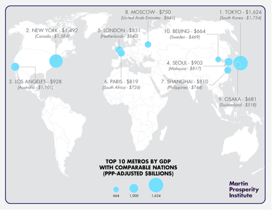 Mega-cities are concentrating ever-greater proportions of the world’s wealth and productivity. The world’s 300 largest metropolitan areas produce nearly half of global economic output, despite hosting just one quarter of the world’s population, according to the Brookings Institution.* The largest, most productive metros are as economically powerful as major countries, as the map below shows. Tokyo’s economic output is comparable to that of South Korea, the world’s 15th-largest economy; New York’s is comparable to Canada; Los Angeles to Australia; and London to the Netherlands.
