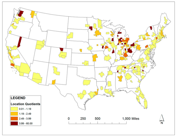 The map below charts the America’s broad robot geography, mapping the location quotients (or LQs) for robotics industries for U.S. metros. An LQ is basically a simple ratio that compares a metro’s share of something—in this case, a metro’s share of robotics-related industries—to the national average. An LQ of 1 means that a metro’s share is the same as the national average; an LQ lower than 1 means that the concentration is less than the national average; and an LQ higher than 1 means that it is more than the national average.