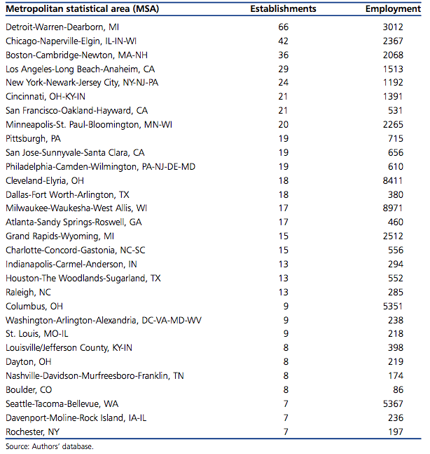 Detroit tops the list, a tribute to its long legacy as a world-leading automotive hub—robots have long been used in automotive production. Indeed, its 66 establishments make Detroit a substantially bigger hub then Chicago, which has 42 robotics establishments. Next in line is Boston, a center for robotics research and technology around MIT, followed by Los Angeles and New York.