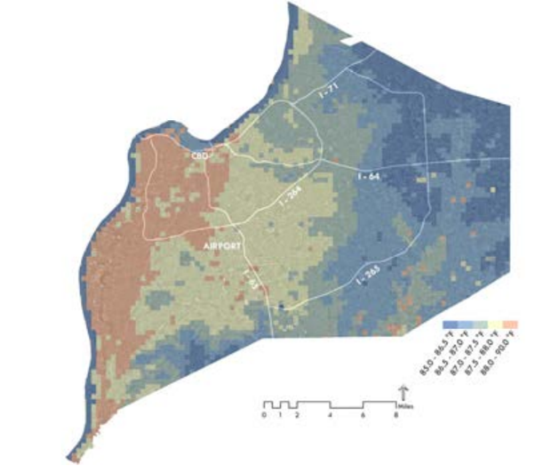 Louisville, Kentucky, is the nation’s fastest warming “urban heat island.” Local temperatures in the center of this city of 600,000* are significantly warmer than in surrounding rural areas, thanks to a uniquely sparse—and rapidly diminishing—urban tree canopy. Cars, parking lots, buildings, and heat-trapping construction materials don’t help, either. The effects of UHI vary from neighborhood to neighborhood; some spots can be as much as 10 degrees warmer than others within city limits. For the most vulnerable locals, the effect can be lethal: an analysis of the scorching summer of 2012 showed 53 people in the Louisville area alone died from causes likely related to human-amplified temperatures. Climate change is making things worse.