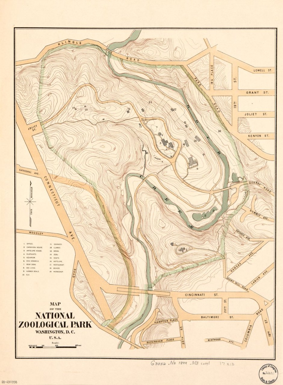 The Olmsteds designed the National Zoological Park to be the meeting-place between the city and the sylvan. The city grew up around the National Zoological Park; the park’s many pedestrian entrances were designed to be seamless points of contact between urban life and nature, and they still serve that function today. “The Zoo was not meant to be an isolated element in Washington’s development,” reads its 1969 nomination to the National Register of Historic Places.