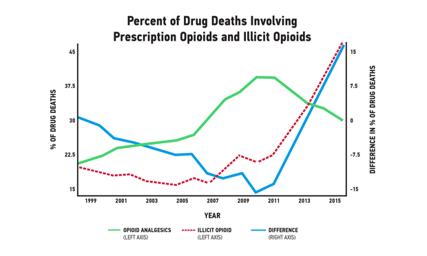 It is important to note that there are other explanations for why illicit drug use expanded around 2010. In the years prior, doctors prescribed drugs like OxyContin liberally and widely for chronic pain, particularly in Rust Belt and Southern states. Some individuals who were prescribed opioids—often simply because of severe pain—became addicted. However, as the crisis grew, regulators and medical professionals started to tighten access to these drugs. This caused a significant change in the drug environment, and played a role in changing the landscape of America’s drug deaths.