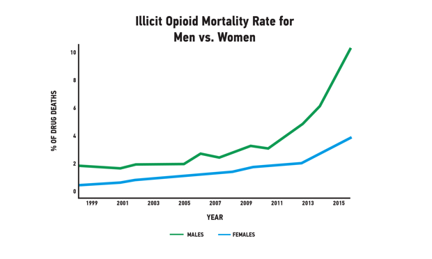 The charts below illustrate this, showing the huge spikes in deaths from illegal opioids among men, younger adults, and white people, starting around 2010 or 2011. The first graph shows a wide divergence between men and women in deaths from illegal opioids. While men have always died at higher rates than women, take a look at the huge gap in male versus female deaths starting around 2010.