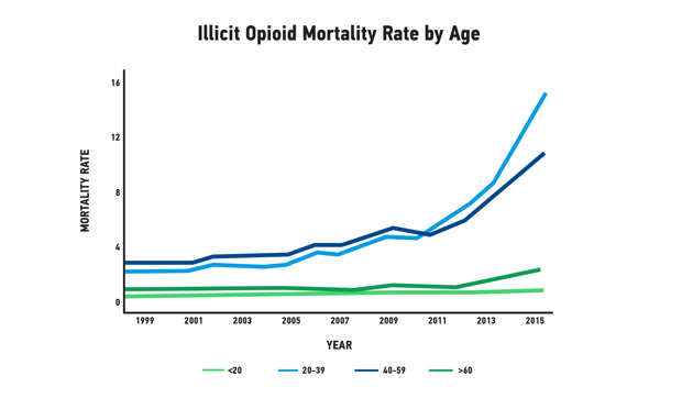 The second graph shows a similar pattern for adults between the ages of 20 and 39. Again, we not only see a sharp uptick of illicit opioid use around 2010, but also a growing gap between young adults and other age groups.